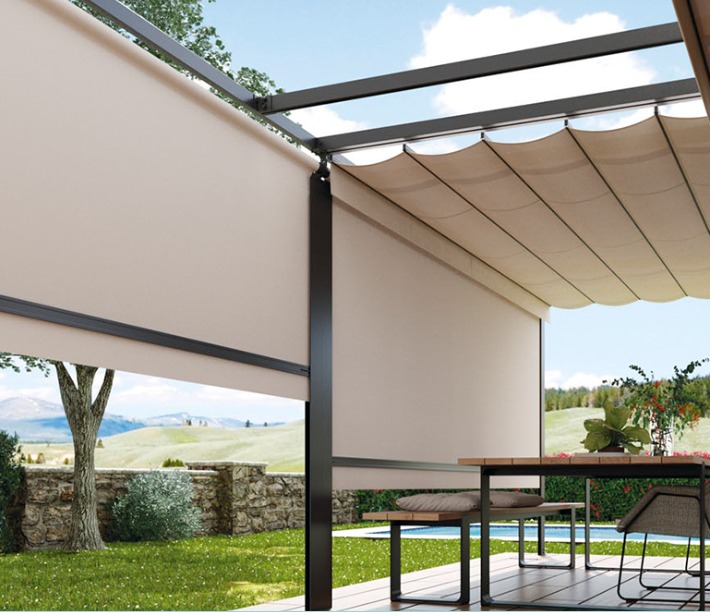 Toldo de terraza que permite crear nuevos espacios protegidos del sol. Es una instalación estructural con múltiples posibilidades dimensionales de cierre perimetral.